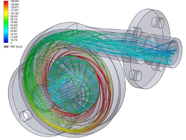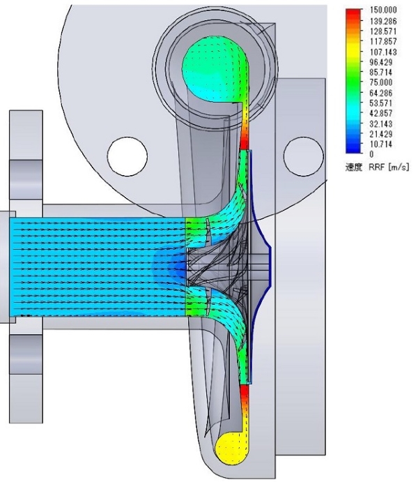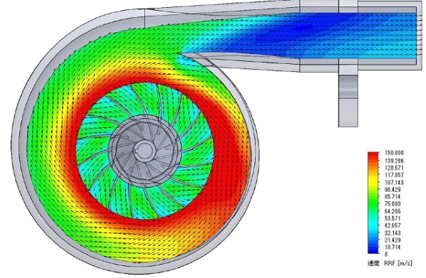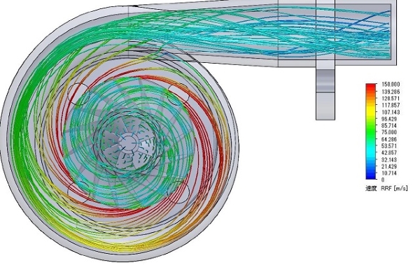 比速度200の高効率で高速型の3次元羽根遠心ブロワーの性能解析結果図です。 渦巻ケーシング出口巻きじまい部の形状に、流れを邪魔している部分があることがわかります。