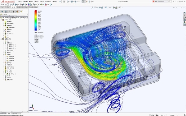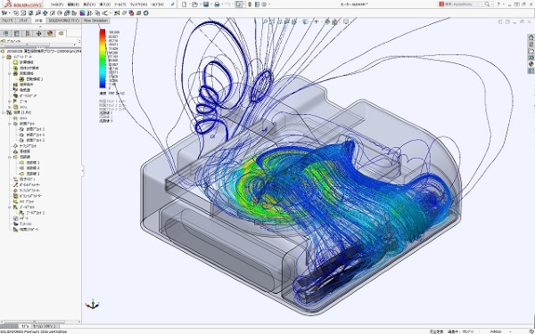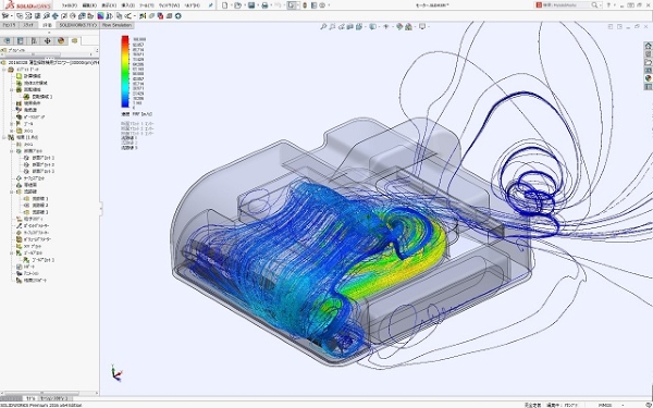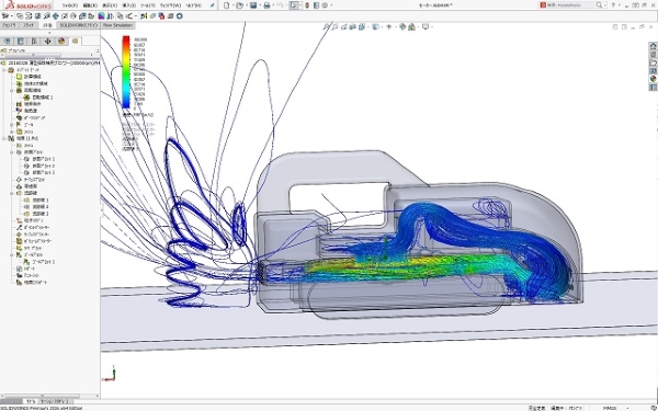 軽量で小型の布団掃除機の運転時流れ解析の結果です。 布団掃除機内部での空気の流れ状態を見ると、ブロワー出口流れをゴミ吸引部に戻して循環させる流れが空気流れの中心となっています。 それにより、強力に布団ダストを吸込むとともに、周りの空気も汚さない使いやすい布団掃除機になっています。