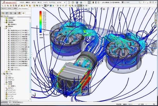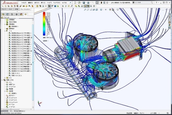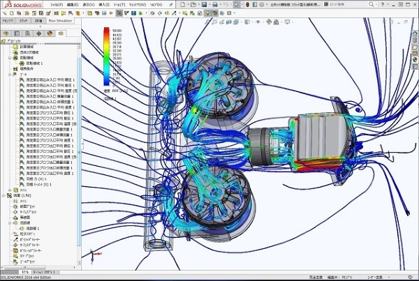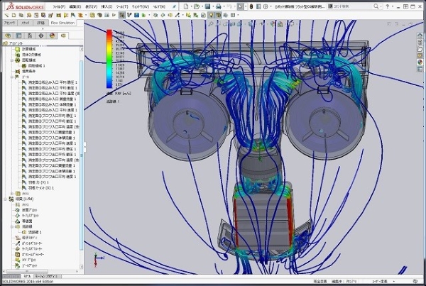 今回のロボット掃除機運転時の流れ解析シミュレーションでも、掃除機の吸い込みノズル部からサイクロンゴミポッド、吸い込みブロワー、排気後空気流れまで、完全にトータルで流体解析が出来ています。