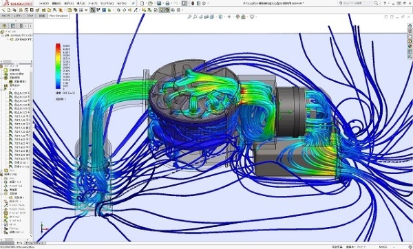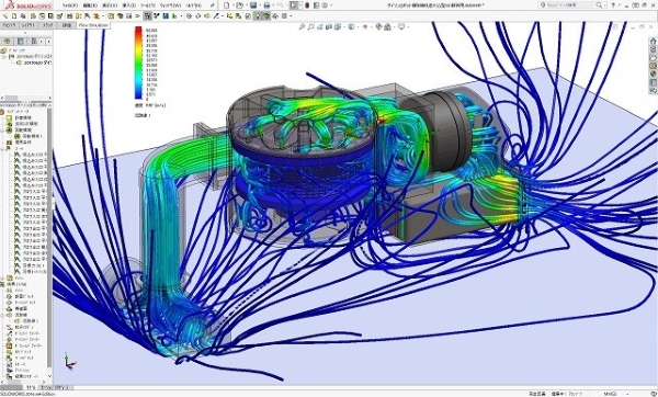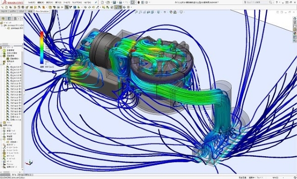 今回のロボット掃除機運転時流体解析シミュレーションでも、掃除機用高速ブロワーがシミュレーション中で回転して発生した吸い込みと吐出の流れにより掃除機全体の流体部流れを正確に再現できています。