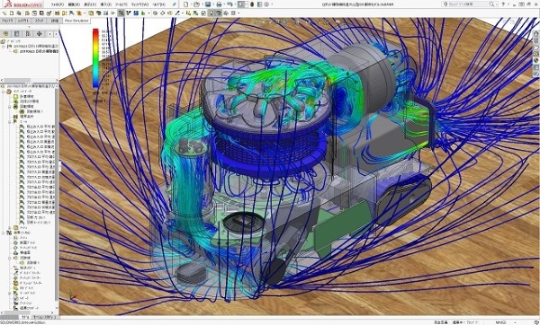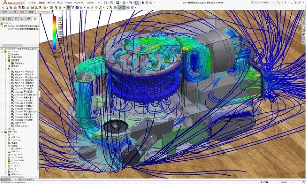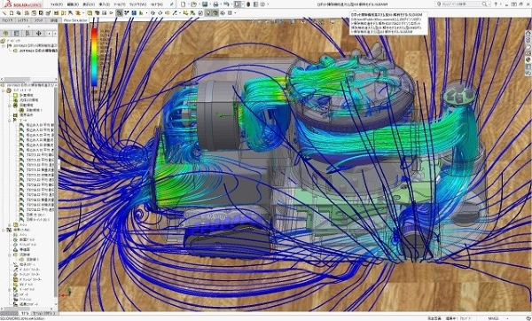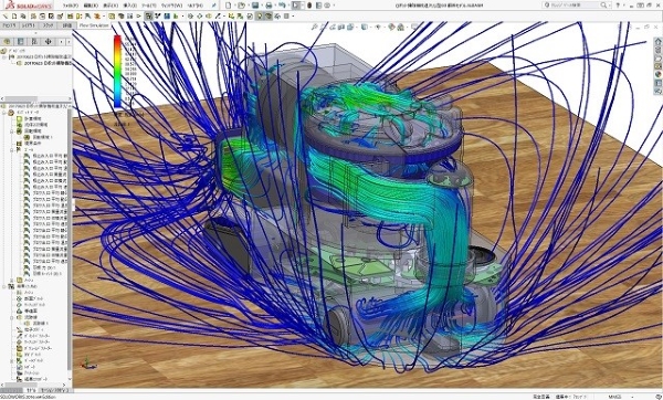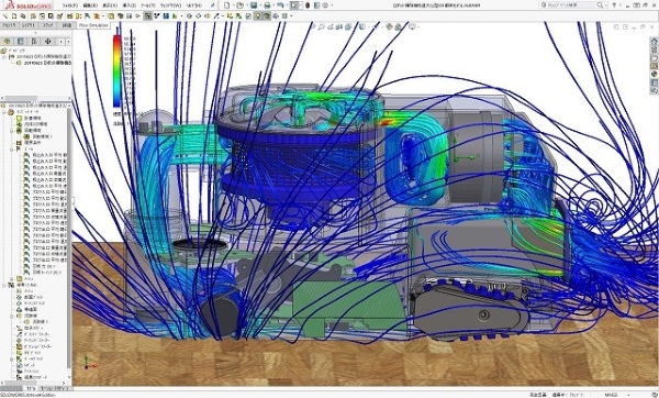スケルトンメカロボット掃除機(スリム短縮Ver)の運転時流体解析シミュレーションの結果図です。 小型ロボット掃除機であるこのタイプは、オフィスなどのデスクの間を縦横に動き、掃除をしていく運転状態でのゴミと空気の流れのシミュレーションがこのように出来ています。