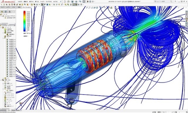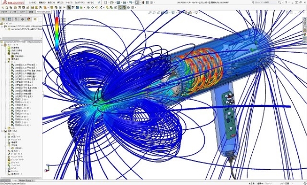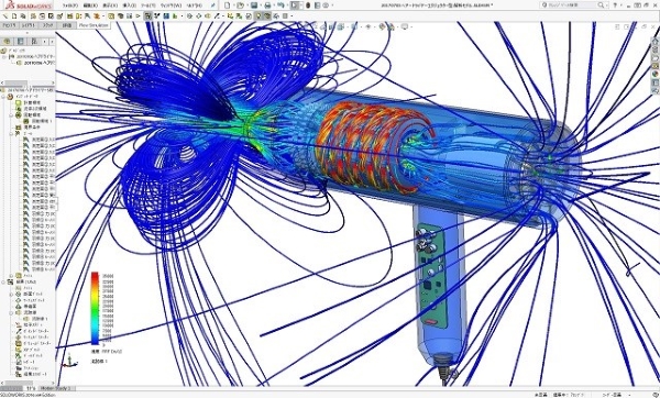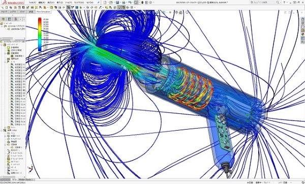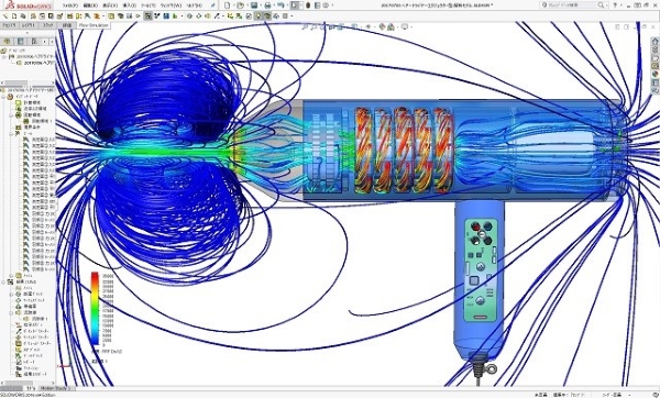 強風を造れる多段遠心ブロワ式のヘアードライヤーとして設計した2号機の作動時の流れシミュレーション結果です。