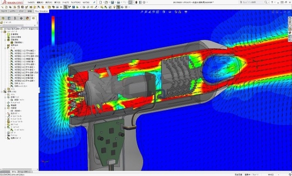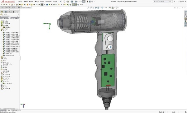 超高速回転で単段のプロペラ型軸流ブロワーを使った強力に送風する小型ヘアードライヤーを設計して、それの流体解析シミュレーションを行った結果図です。