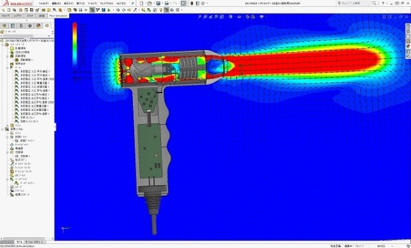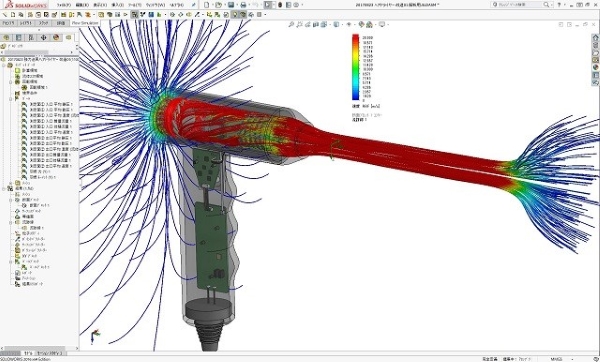 流跡線図からは、空気のドライヤーへの吸込みと内部ブロワーにより強力に空気が加速される様子、そしてまっすぐに噴き出す強力な送風が良く分かります。