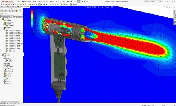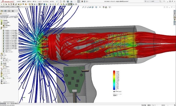 また、単段軸流ブロワー部の吸込みから加速までの流れも良く分かり、空気加熱ヒーター部を少し減速しながら通る様子とノズルで再加速されることも分かります。