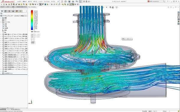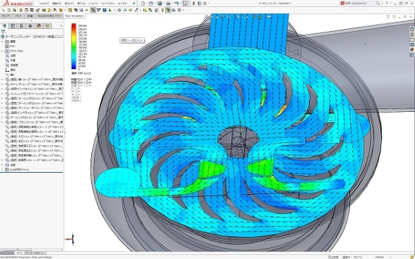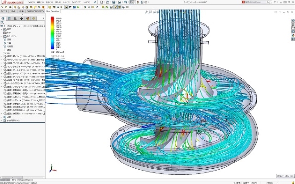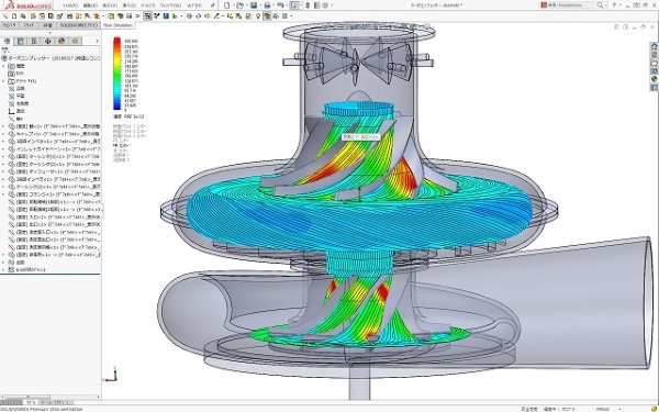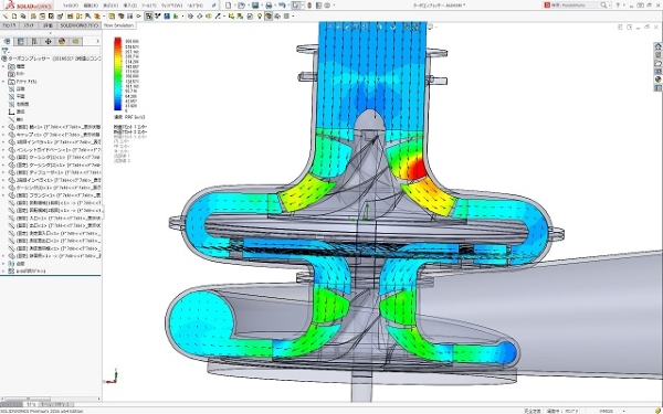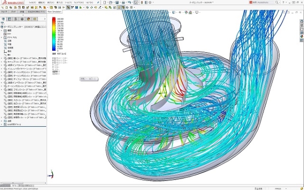 代替フロン用の2段遠心コンプレッサーの初回の流れ解析結果です。 流れの流跡線群を見ると、羽根から渦巻きケーシングにかけて良い流れ状態となっています。 また、ブレード翼間流れ状態も滑らかで、子午面断面での流れ状態もほぼ均一に流れており、ロスが少ない状態です。