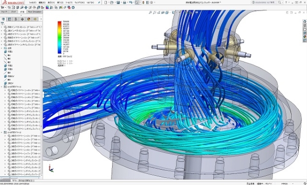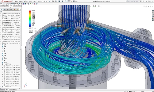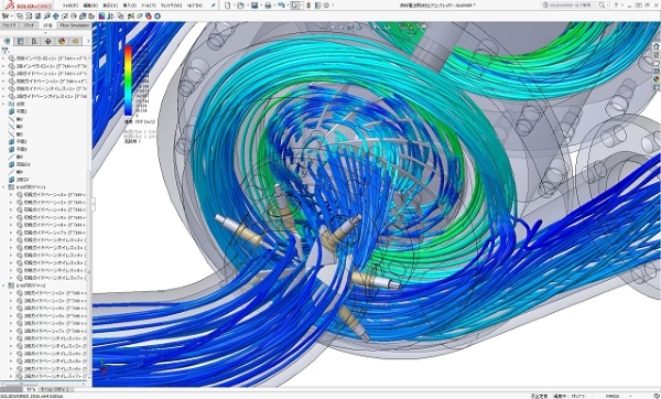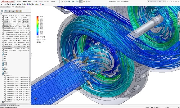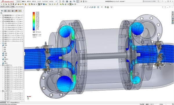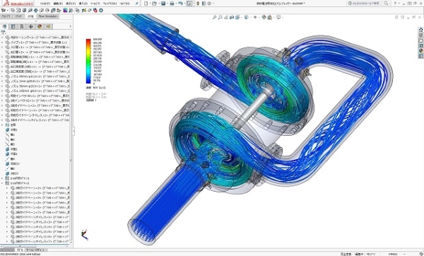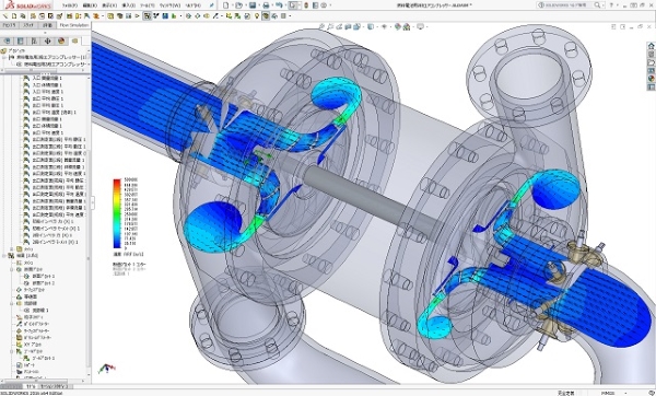 燃料電池車用の燃料電池に空気を供給する、可変インレットガイドベーン付2段遠心コンプレッサーの流体性能解析結果です。 解析結果から、このコンプレッサーは小流量側でのサージング領域をより小流量側に移動させ、小流量での効率が上がることを確認しました。 つまり、燃料電池車が出力の低い状態でも高い効率で運転できることを示しています。