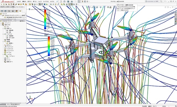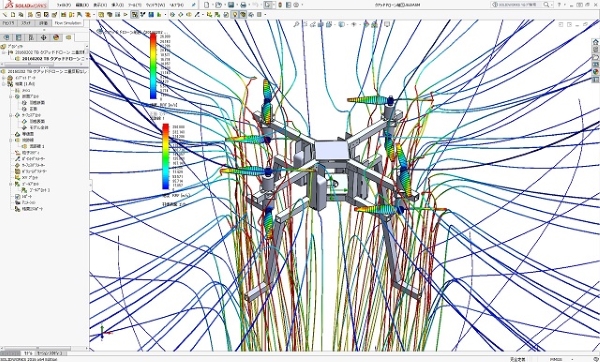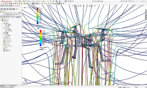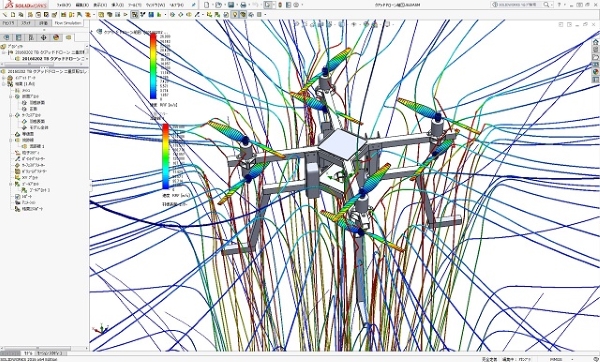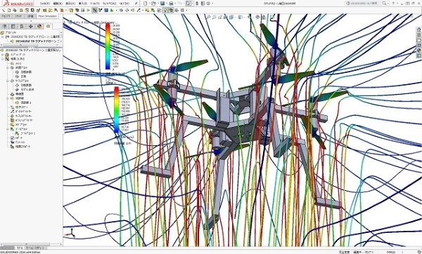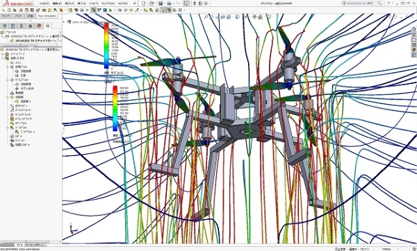 クアッド型2重反転プロペラドローンの流体性能解析の結果図です。 2重反転プロペラをクアッド配置にすることで、8枚プロペラのオプトコプターと同様な推力を確保しながら全体を相当に小型化出来る利点を持っています。