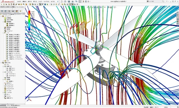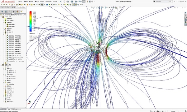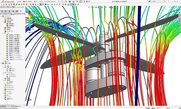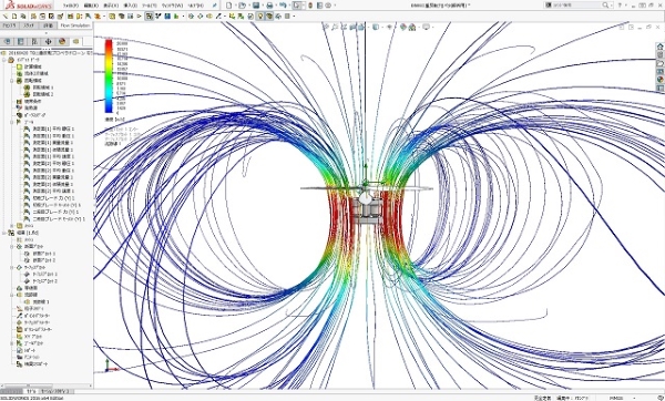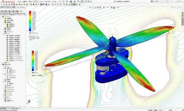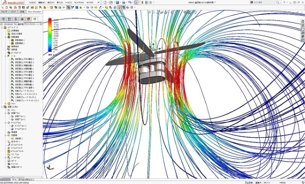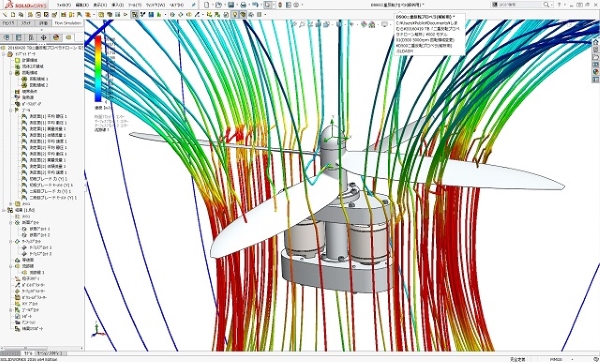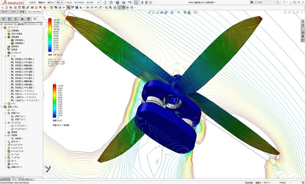 2重反転プロペラユニットの流体性能を解析して求めました。 推力は5kgを発生しています。