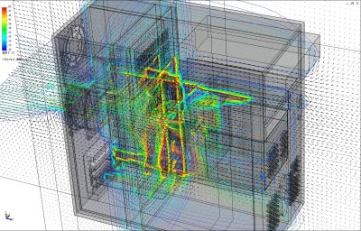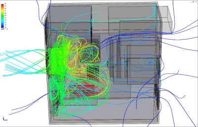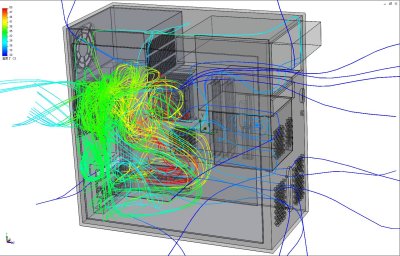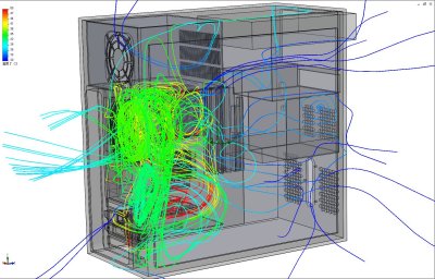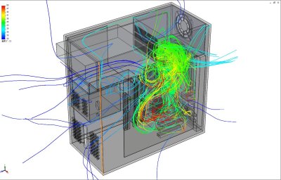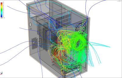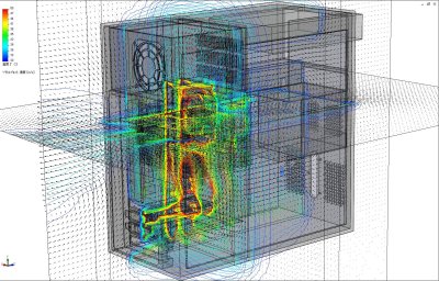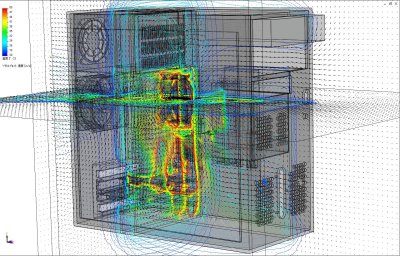 デスクトップPC筐体内の冷却空気流れと温度分布を解析した、熱流体解析事例です。