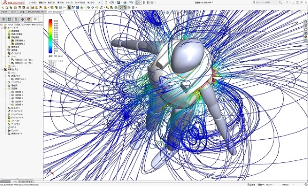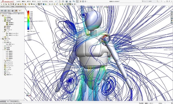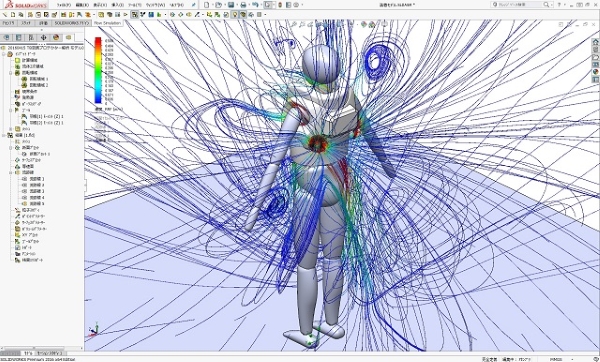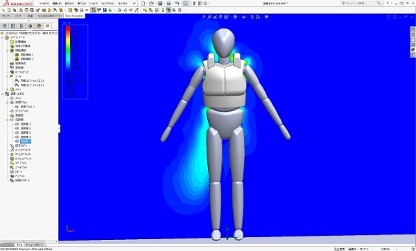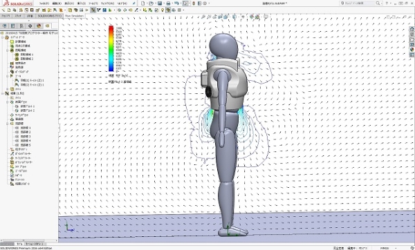 空調用のファンが外部から取り入れた空気をプロテクター内部にどのように流しているかを検証する流体解析です。