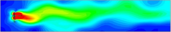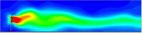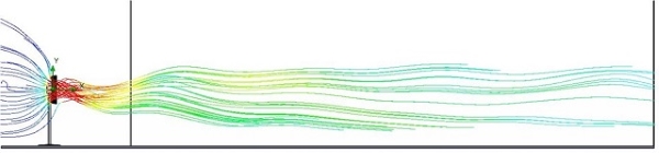 家庭用流体機械の設計例で、遠くまで風がとどく扇風機の流れ解析の解析モデルと解析結果図です。 上図は、扇風機からの流れの速度分布を色分けしたものと、扇風機からの空気の流れを流跡線として表したものです。 これらの解析結果から、この扇風機は遠くまで風をとどかせる性能に優れていることが分かります。