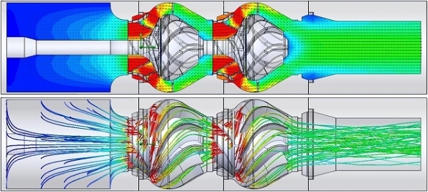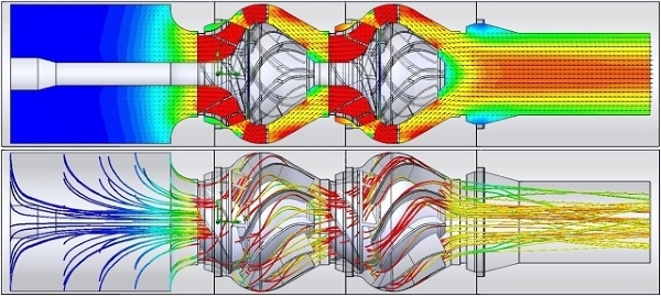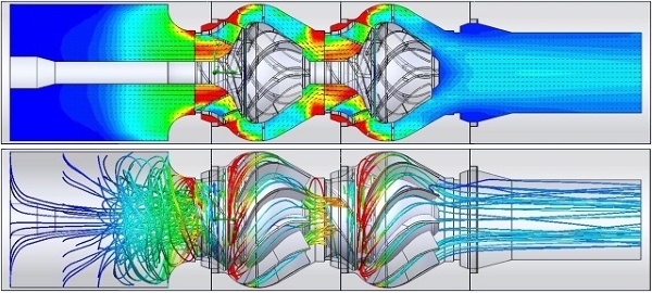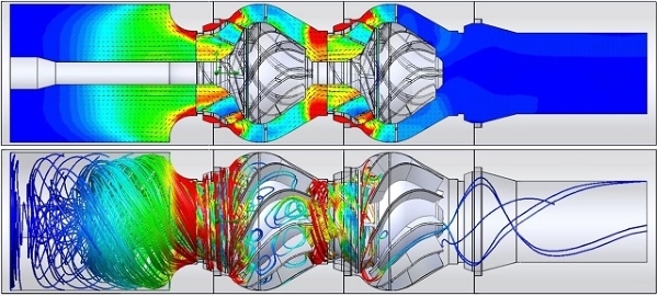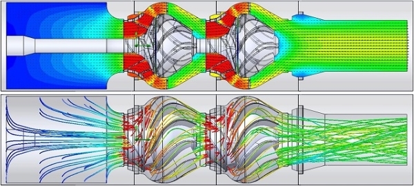 高性能な2段斜流ポンプの流体性能解析結果図です。 上図は流量変動による流れの変化を速度コンターと流跡線で示しており、一番上から流量0%・25%・50%・75%・100%となっています。