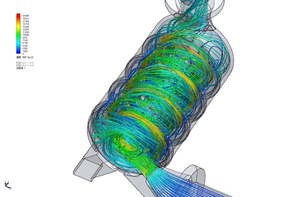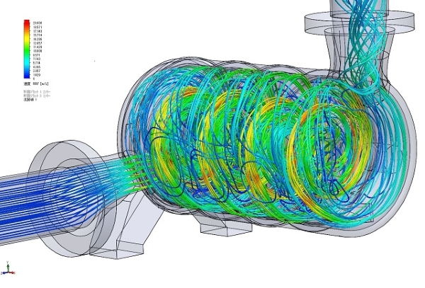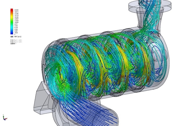 高圧多段ポンプの流体性能解析事例です。 段ごとの間隔を広く取り、リターン羽根などの通路を無理なく次の段に繋がる設計にすることで、多段ポンプ全体の効率を改善した設計となっています。
