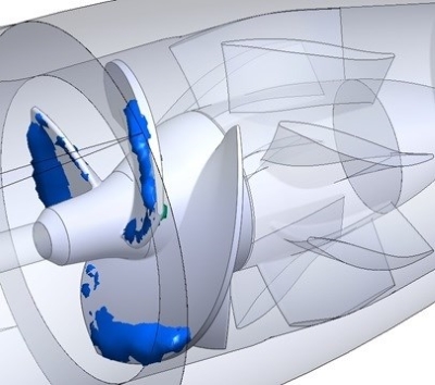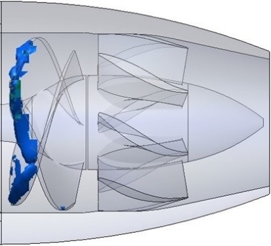 燃料圧送用ポンプで、初段がインデューサーポンプとなっている高速ポンプのキャビテーション発生状況を解析した結果図です。