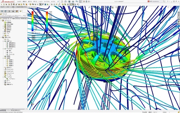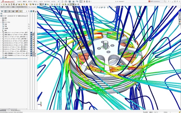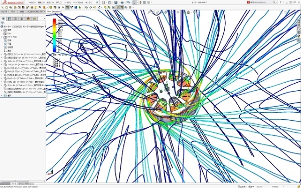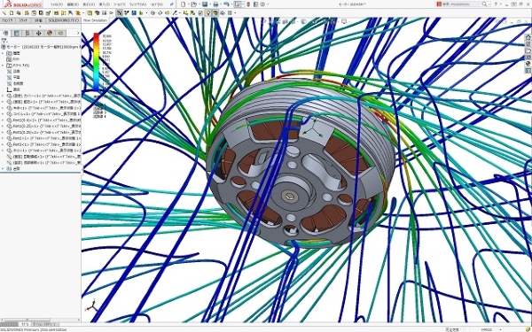 モーターの運転時熱解析を行い、モーター周りの空気の流れ状態とモーター本体の温度分布を求めることが可能です。