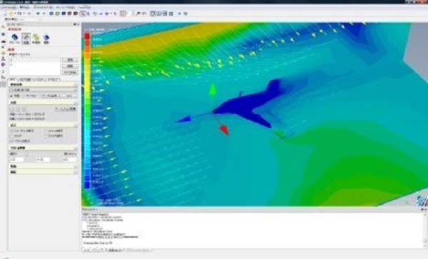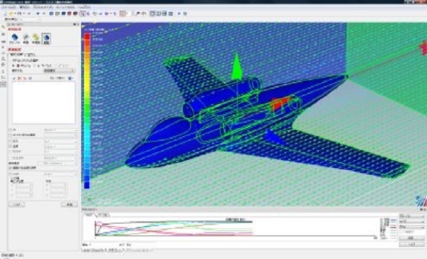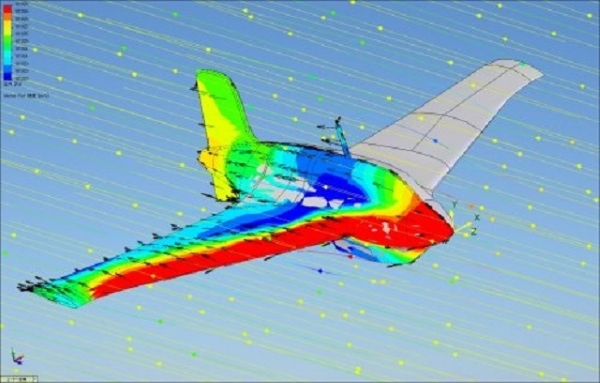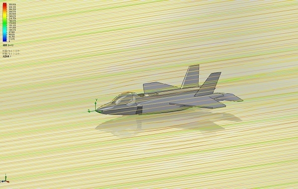 飛行機体の流れ解析シミュレーション結果例です。 様々な機体形状の流れ解析シミュレーションを行い、機体の揚力値・抵抗値・マッハ数・衝撃波状態などを出しています。 それにより、必要なエンジン推力や飛行状況の検討を行います。