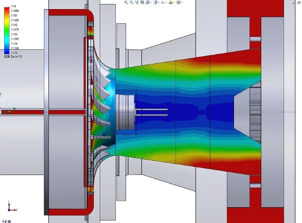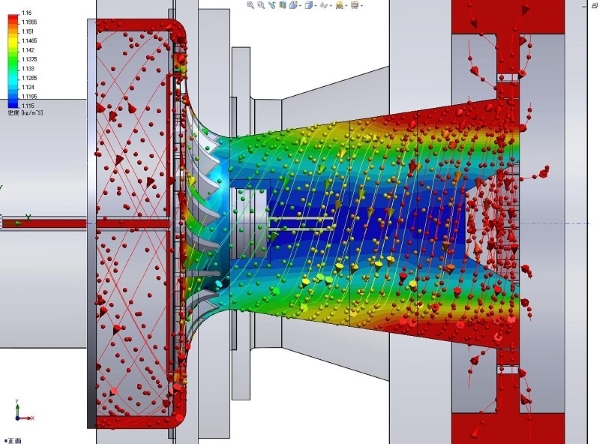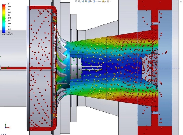 サイクロン型の密度分離機の性能解析結果図です。 これは、上図の右側に旋回流れを作る案内羽根部があり、左側の高速ブロワが強力に気体を吸込むことによる旋回サイクロン流れが、密度の異なる混合気体を分離する機械となります。 上図での色分けは気体の密度を表しており、気体の流れ状態を粒子と流線で表しています。