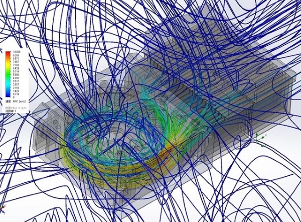 一番上の図は、強制空冷用に設計したシロッコファンに近い形状を持つ遠心ファンが廻りの空気を吸い込み、 熱を発生している電子機器の上部に付けられた冷却フィンに空気が送り込まれる様子を熱流体解析シミュレーションの流線図で見たものです。