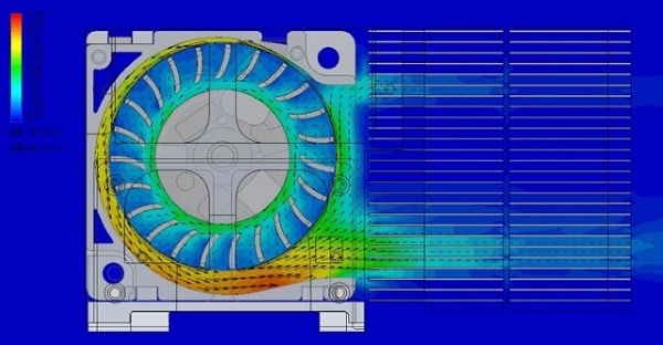 冷却フィンへの均一な空冷風の流れ込みを造るためには、冷却ファンと冷却フィンの間に風向を整えるガイド羽根を付ける方法か、空冷ファンと冷却フィンの距離を離して滑らかに風を導く風路を形成する必要があります。