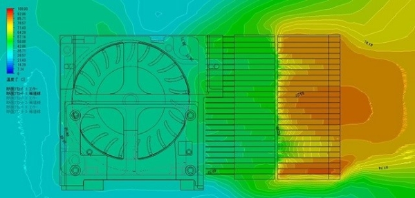 二枚目は、強制空冷用ファンから冷却フィンへの断面での流れを速度の色分布で見たものですが、冷却フィンに空気が入る状態に流れの偏りが見られ、特にフィン中央部にはほとんど冷却風が流れ込まない冷却効率の悪い結果となっています。