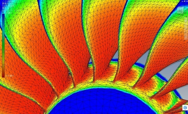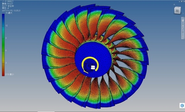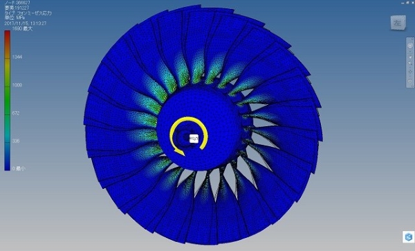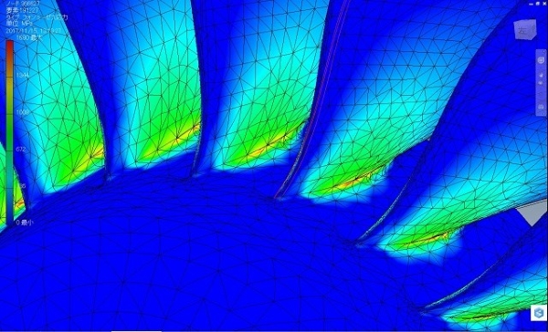 上図の上から二枚は、遠心力によりファンブレードに発生する応力の分布色分け図です。