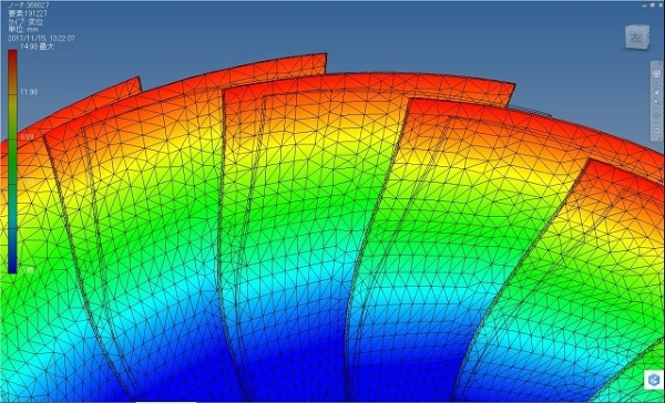 その次の二枚は、遠心力によるブレードの変位分布図です。3次元複雑曲面羽根として設計したために変位がかなり大きく出ており、ファンブレードのボスからチップまでの部分翼型の積み上げ中心ラインをシンプルな直線状に変更しなければならないようです。