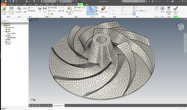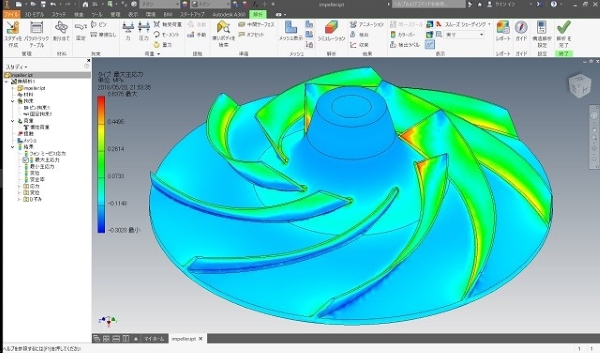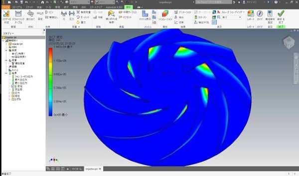 一般的な3次元形状羽根タイプの遠心ポンプインペラ、遠心力強度解析例です。