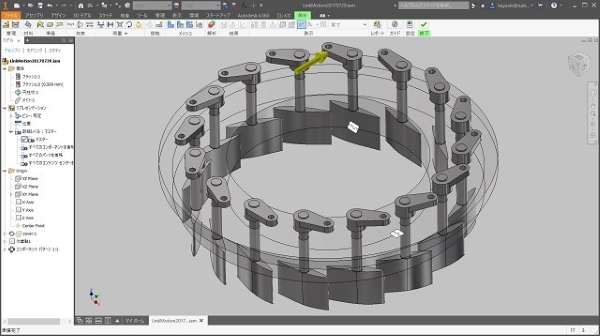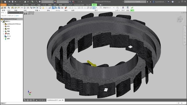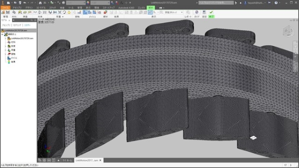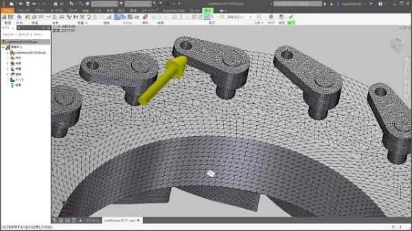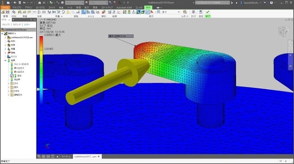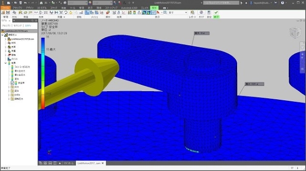 フランシス水車のガイドベーンにかかる水圧の流体力によるガイドベーンアーム部の強度構造解析の例です。 フランシス水車の16枚のガイドベーンが上カバーに取り付けられている状態で、ガイドベーンアームのリンクピン付近に回転する力を、流体力の作用として流体解析から持ってきた値をかけます。 この結果、最低安全率でも10.5ありますので、安全率5以下のところは全くなく、繰り返し開閉荷重がかかっても安全です。