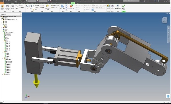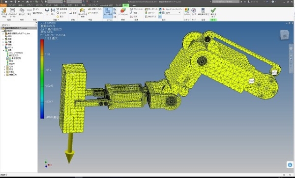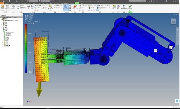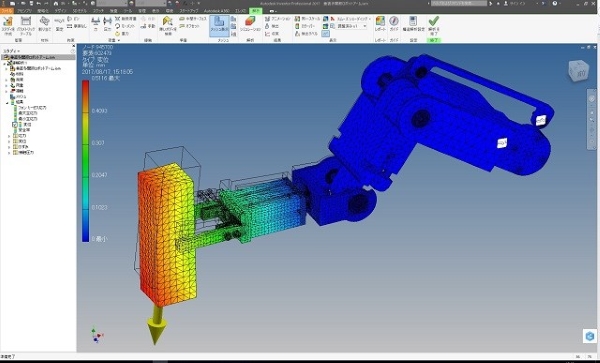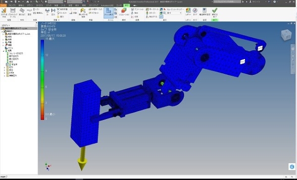 ロボットアームの構造解析の事例で、重い鉄の塊を保持した場合の全体強度を解析しました。 これらロボットアームの構造解析結果図から分かることは、各アーム部の接続部の軸や継ぎ手部が細いために応力が集中して安全率を下げていることです。 よって今後は各アーム自体の剛性ではなく、なるべく細く軽量化して、間接接合部を強化する設計へと変更する必要性を得ることが出来ました。